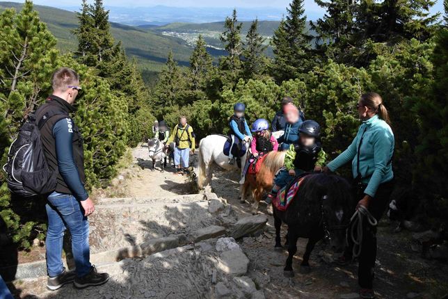 Sześć dorosłych osób i czworo dzieci na kucykach. Nie było w tym nic dziwnego, gdyby nie to, że grupa zmierzała na Śnieżkę - nie dość że w górę, to jeszcze po kamieniach.