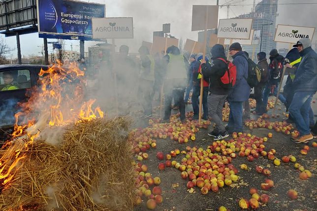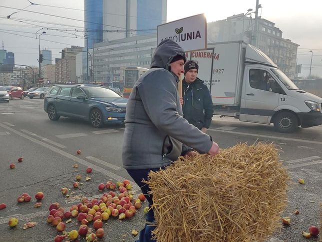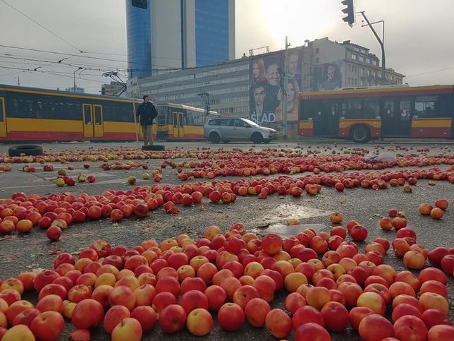 Rolnicy z AGROunii zablokowali plac Zawiszy w Warszawie. Na jezdni położyli świńskie łby, rozsypali jabłka i podpalili opony i słomę. "Te jabłka to dzieciom trzeba dać w przedszkolach, a nie wysypywać na placu i kierowcom przeszkadzać" - powiedział minister rolnictwa Jan Ardanowski.