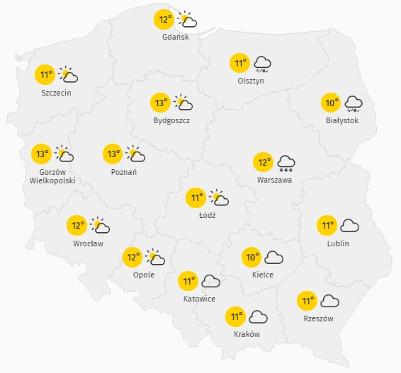 We wtorek nastąpi znacznie ochłodzenie. 10 st. C w Białymstoku i Kielcach. Najcieplej (13 st. C) w woj. kujawsko-pomorskim, lubuskim i wielkopolskim. Na Mazowszu pojawią się opady śniegu. Na Warmii i Mazurach oraz na Podlasiu deszcz ze śniegiemPrzed załamaniem pogody, związanym ze znacznym spadkiem temperatury powietrza, ostrzega też profil Łowcy Burz na Facebooku.